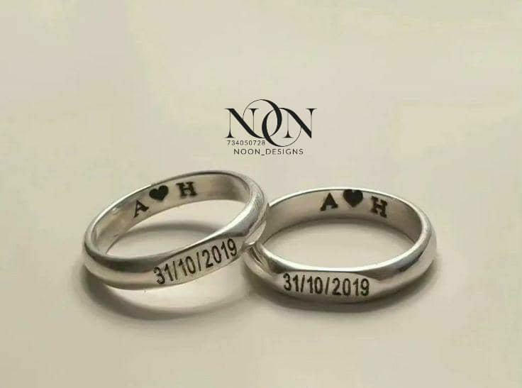 خاتمين فضة بتصميم أنيق وناعم، يدمجان البساطة مع لمسة رومانسية فريدة. النقش الداخلي يضيف طابعًا خاصًا، مما يجعلهما مثاليين كرمز للارتباط والمشاعر الجميلة، مثالي كخواتم زواج او خطوبة تحمل ذكرى خاصه، لمعة الفضة تضفي عليهما جاذبية راقية تناسب كل الأذواق.